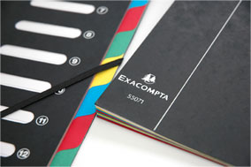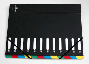 12のパーティションとインデックスの窓の並びが印象的。ファイルを綴じるラバーバンドは大型の金具で固定されています。鮮やかなパーティションと対比するブラックの表紙。その表紙全幅を貫く箔押しホワイトのラインとエグザコンタのロゴが製品を引き締めております。 |