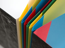 本製品の注目は背表紙部分の作り込み。パーティション1枚ごとに折り返して接合し、マチがジャバラ状に伸縮する仕組み。綴じる用紙の増減にそれこそ「フレキシブル」に対応します。ブラックの表紙の間に見える4色の用紙が視覚的な楽しさも生んでおります。