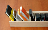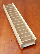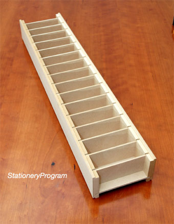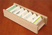 | ・寸法:全長300×奥行120×高さ62(mm) ・パーティション:幅34×奥行97×深さ43(mm) ・材質:MDF素材を主体に長手方向表面にナラ材の薄板を貼った「突板仕上げ」。 |