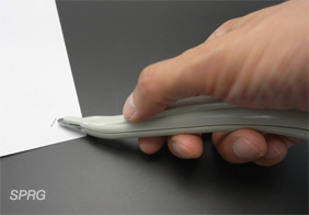 | このタイプのステープルリムーバーは 写真のようにして使います。 まずハンドル部分を持って、、、 |
