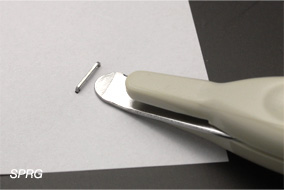 | リムーバーの先端を ステープル(針)の下側に滑り込ませ、 テコのようにハンドル側を下げて ステープルを押し上げます。 |
